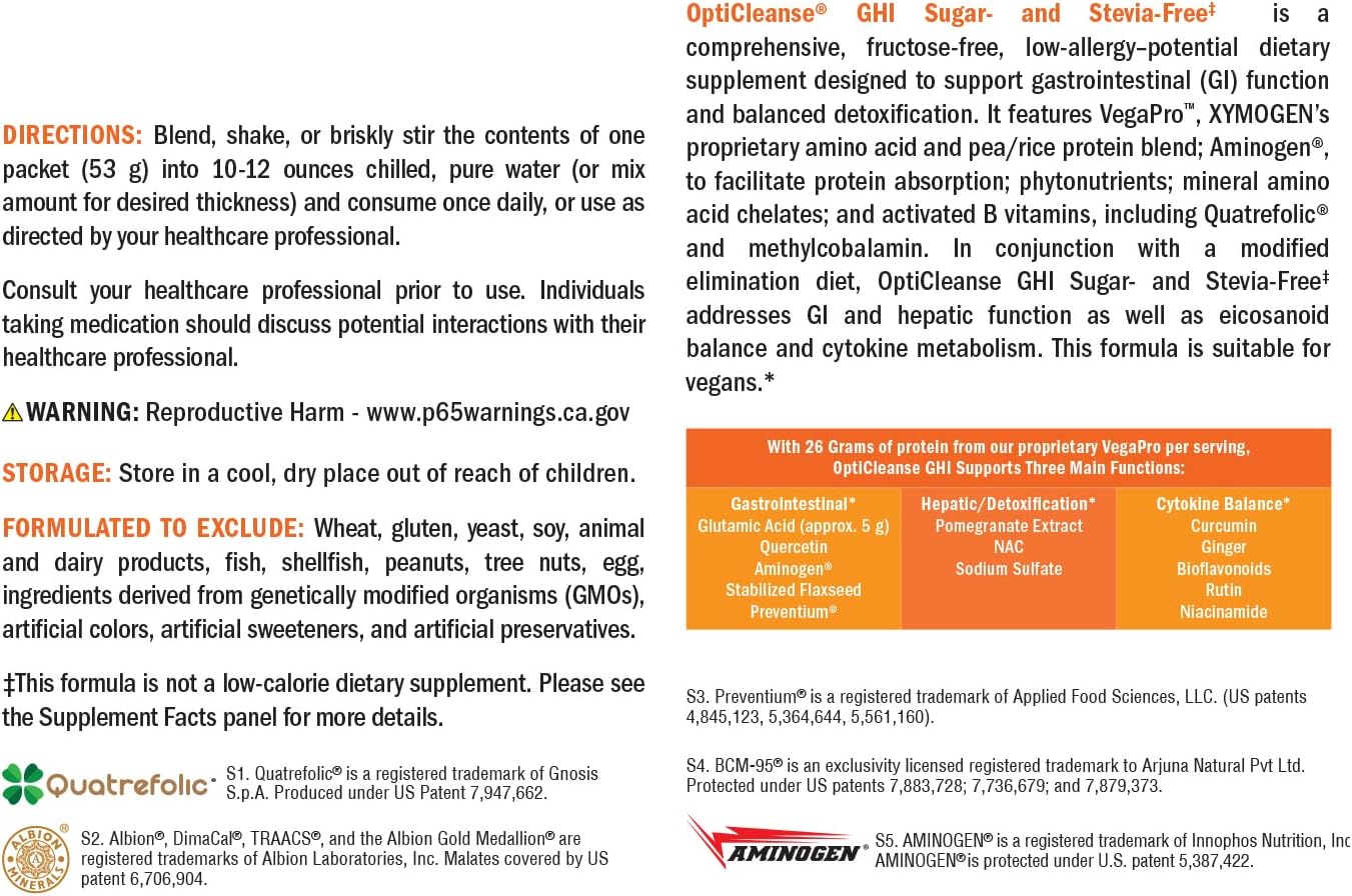 OptiCleanse® GHI Sugar- and Stevia-Free‡ is a comprehensive, fructose-free, low-allergy–potential dietary supplement designed to support gastrointestinal (GI) function and balanced detoxification. It features VegaPro™, XYMOGEN’s proprietary amino acid and pea/rice protein blend; Aminogen®, to facilitate protein absorption; phytonutrients; mineral amino acid chelates; and activated B vitamins, including Quatrefolic® and methylcobalamin. In conjunction with a modified elimination diet, OptiCleanse GHI Sugar- and Stevia-Free‡ addresses GI and hepatic function as well as eicosanoid balance and cytokine metabolism. This formula is suitable for vegans.*